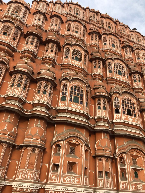 The next stop was the Amber Fort, high on a hill, that is home to the main palace and military. You travel up the narrow roads by Jeep or elephant. Following local style the interior court yards are surrounded by rooms of inlaid marble, fine mosaics and wall paintings. Now a museum, we visited textiles and clothing displays. We were most in awe of the clothes of the large ruler who was seven feet tall and weighed over 350 lbs.
