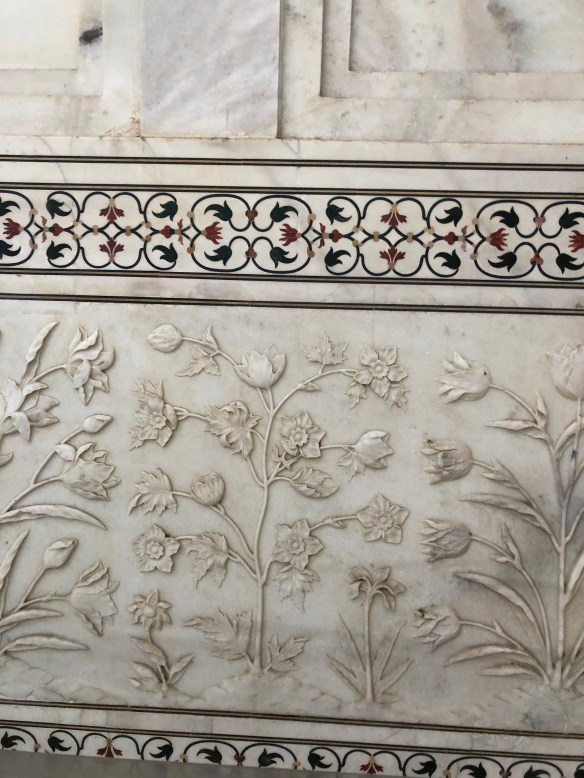 Agra is the home of the beautiful Taj Mahal. The love story behind the construction of mausoleum is beautiful. The mausoleum holds the body of the Queen and her King. It was built in memory of herby him so his position is subservient to hers. It is built of white marble with carvings and inlays throughout. If you are interested in the love story behind the Taj Mahal read Beneath a Marble Sky, by John Shor.