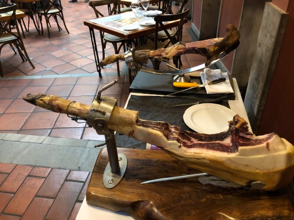 In spite of the mess ups the trip has been very interesting. The first day we went to a vineyard. We tasted several kinds of wine and had a gourmet lunch that was beyond belief. Everyday we have beautiful meals. The most frequently served delicacy is the regional wild boar ( black hair but no tusks) that feed on acorns in the oak forests. The rear legs of the female are packed in salt for several days and then air dried for several months. People buy an entire leg for the family. The lower priced domestic pigs have white feet and the boats have black feet.